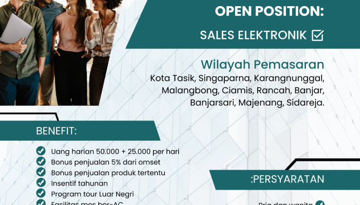 Kami mencari Pria dan Wanita yang dinamis untuk mengisi posisi Sales Elektronik dengan wilayah pemasaran yang sangat luas, mencakup Tasikmalaya, Ciamis, hingga Banjar dan Majenang. Dapatkan paket benefit yang sangat menarik, termasuk Uang Harian, Bonus Penjualan 5% dari Omset, hingga Program Tour Luar Negeri! Jika Anda berusia 25–40 tahun dan wajib memiliki motor, segera daftar loker Sales Elektronik terbaru di Tasikmalaya ini.