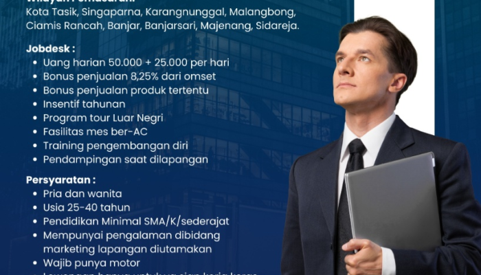 Ini adalah kesempatan emas bagi Anda yang mencari Loker terbaru Tasikmalaya dengan skema penghasilan dan bonus yang sangat menarik. Kami mengundang pribadi yang siap bekerja keras dan berorientasi pada hasil untuk tumbuh bersama tim profesional kami.