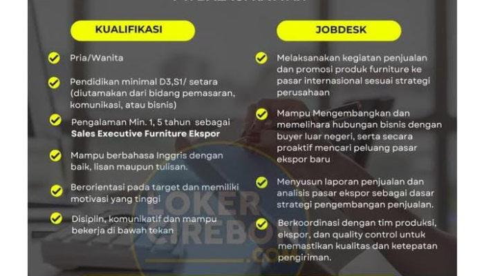Berikut adalah kriteria yang dibutuhkan untuk mengisi posisi Loker Sales Ekspor Cirebon: