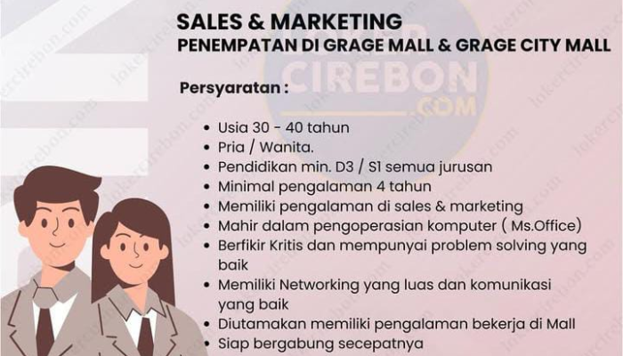 Mencari tantangan baru di dunia sales dan marketing? PT. Kreasi Akar Sembilan membuka kesempatan emas bagi Anda untuk bergabung sebagai Sales & Marketing dengan penempatan di pusat perbelanjaan ternama, yaitu Grage Mall dan Grage City Mall, Cirebon. Jika Anda memiliki pengalaman solid, jaringan luas, dan siap berkontribusi dalam tim yang dinamis, ini adalah kesempatan yang tidak boleh dilewatkan. Mari bersama kami mencapai target dan mengembangkan karir profesional Anda!