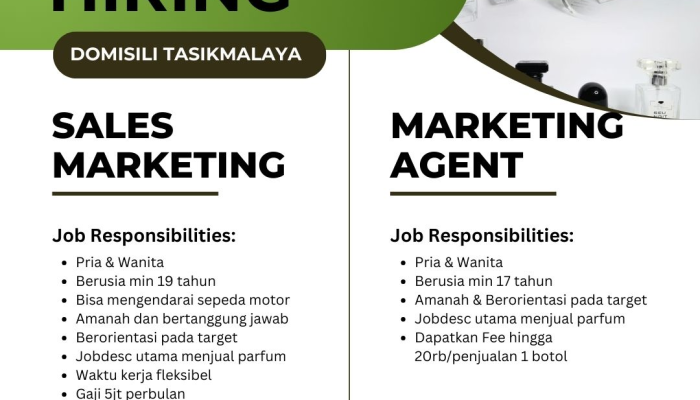 Apakah Anda seorang pria atau wanita yang tertarik dengan dunia pemasaran dan penjualan, serta bersemangat untuk mencapai target? Seungit Indonesia, sebuah brand parfum lokal, membuka kesempatan emas untuk Anda! Kami sedang mencari individu yang berorientasi pada target dan bertanggung jawab untuk bergabung sebagai Sales Marketing dan Marketing Agent di wilayah Tasikmalaya.