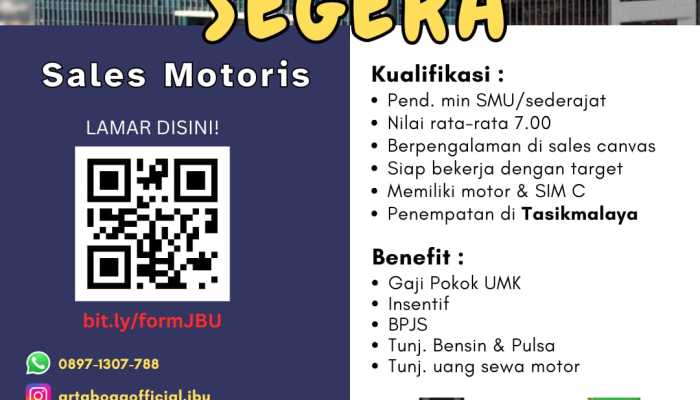 Apakah Anda seorang pejuang lapangan yang ambisius dan ingin bergabung dengan distributor produk konsumen terkemuka di Indonesia? Arta Boga-Cemerlang (OT Group) sedang membuka lowongan kerja untuk posisi Sales Motoris untuk penempatan di wilayah Tasikmalaya. Kami mencari individu yang siap bekerja dengan target dan memiliki pengalaman di bidang penjualan retail untuk mendistribusikan produk-produk unggulan kami.