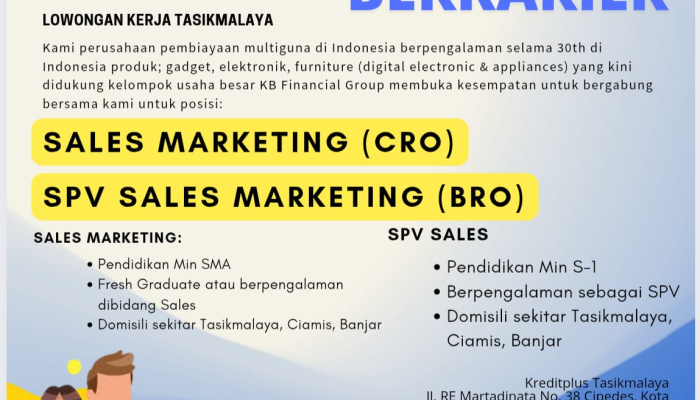 Apakah kamu seorang yang memiliki jiwa marketing dan siap berkarir di industri pembiayaan yang dinamis? Kreditplus, yang merupakan bagian dari PT. KB Finansia Multi Finance, membuka kesempatan untuk bergabung di tim kami yang berlokasi di Tasikmalaya. Dengan dukungan penuh dari grup usaha besar KB Financial Group, kami mengajak para profesional dan fresh graduate bersemangat untuk mengisi posisi Sales Marketing (CRO) dan SPV Sales Marketing (BRO). Jika kamu siap untuk mengembangkan karir dan menjadi bagian dari perusahaan yang berpengalaman, mari simak kualifikasi selengkapnya!