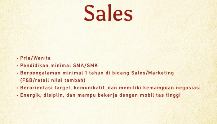- Pengalaman: Berpengalaman minimal 1 tahun di bidang Sales/Marketing. (Pengalaman di bidang F&B atau retail akan menjadi nilai tambah).