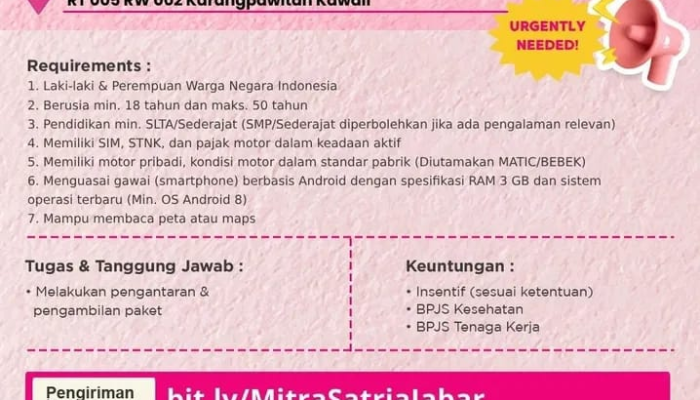 - Akses tautan pengiriman lamaran: bit.ly/MitraSatriaJabar.
