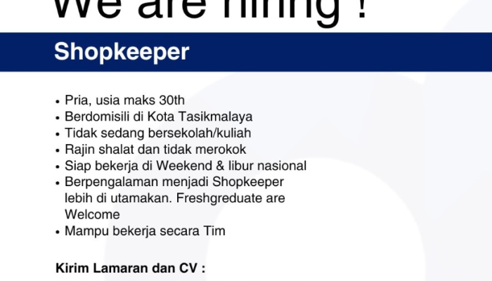 Apakah Anda seorang pria yang disiplin, jujur, dan sedang mencari tantangan baru di dunia retail? Davin Store, spesialis aksesoris gadget, sedang membuka kesempatan bagi Anda untuk bergabung sebagai Shopkeeper. Jika Anda memiliki semangat melayani dan ingin berkarir di lingkungan yang produktif di Kota Tasikmalaya, inilah saat yang tepat untuk melamar!
