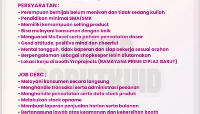 Kabar baik bagi kamu yang sedang mencari lowongan kerja penjaga toko di Garut! YMProjects Handmade Accessories saat ini membuka lowongan kerja Shopkeeper / Penjaga Toko untuk penempatan di booth YMProjects yang berlokasi di Ramayana Prime Cipaz Garut. Posisi ini cocok bagi perempuan berhijab lulusan SMA/SMK yang memiliki kemampuan melayani pelanggan dan tertarik bekerja di bidang retail aksesoris handmade.