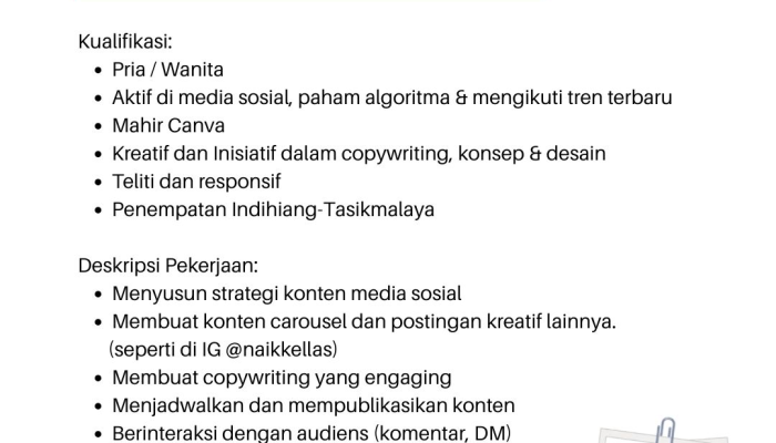 Apakah kamu aktif di media sosial dan punya passion dalam membuat konten kreatif? Saat ini Naik Kelas membuka lowongan kerja Social Media Specialist untuk penempatan di Indihiang, Tasikmalaya. Posisi ini sangat cocok bagi kamu yang kreatif, responsif, dan ingin berkembang di dunia digital marketing.