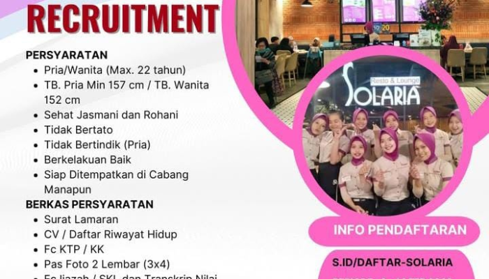 Apakah Anda sedang mencari peluang karir di industri Food & Beverage (F&B) yang prestisius? Solaria, salah satu jaringan restoran keluarga terbesar di Indonesia, sedang membuka kesempatan emas bagi talenta muda berbakat untuk bergabung menjadi bagian dari tim profesional mereka.