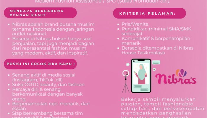 Apakah Anda gemar tampil stylish dan aktif di media sosial seperti Instagram atau TikTok? Inilah saatnya mengubah hobi Anda menjadi penghasilan tetap! Nibras House Tasikmalaya sedang membuka kesempatan berkarir bagi Anda yang berjiwa muda dan inspiratif untuk bergabung sebagai Moslem Fashion Assistance (MFA) / SPG (Sales Promotion Girl).