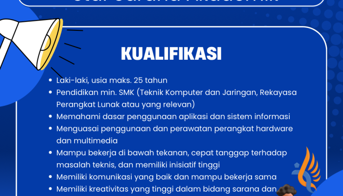- Mampu bekerja di bawah tekanan, cepat tanggap terhadap masalah teknis, dan memiliki inisiatif tinggi