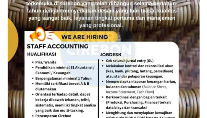 Apakah Anda seorang profesional di bidang akuntansi yang teliti, sistematis, dan memiliki kemampuan analisis yang kuat? PT Balagi Rattan, produsen rotan terkemuka di Cirebon, sedang membuka kesempatan karir bagi Anda untuk bergabung sebagai Staff Accounting. Kami mencari individu yang berdedikasi untuk mengelola laporan keuangan dan perpajakan perusahaan kami guna mendukung manajemen yang profesional dan transparan.