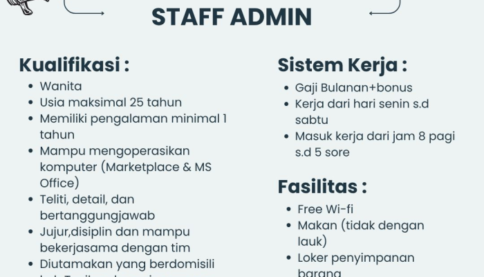 Loker Staff Admin Singaparna Terbaru – Apakah Anda seorang wanita yang mahir mengoperasikan komputer dan sedang mencari peluang karir di bidang administrasi? Vibesbags, unit bisnis yang bergerak di bidang penjualan tas, saat ini membuka lowongan pekerjaan untuk posisi Staff Admin.
