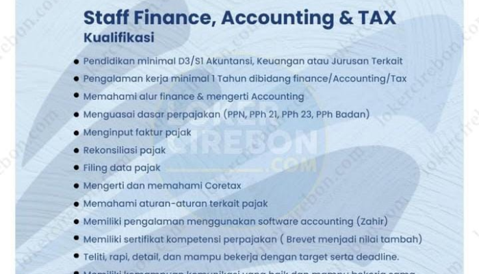 - Pendidikan: Minimal D3/S1 Akuntansi, Keuangan, atau jurusan terkait.
