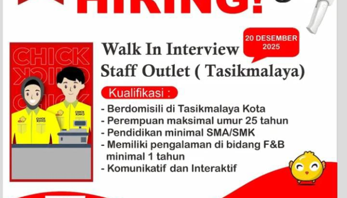 ChickChick Snack, brand kuliner yang sedang berkembang pesat, kembali membuka kesempatan kerja bagi kamu yang berdomisili di Tasikmalaya dan ingin membangun karier di industri Food & Beverage (F&B). Peluang ini cocok untuk perempuan muda yang komunikatif, ramah, dan siap bekerja di lingkungan outlet yang dinamis. Proses rekrutmen dilakukan melalui Walk In Interview — jangan lewatkan kesempatan ini!