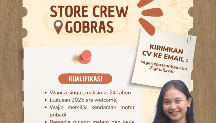 Apakah Anda seorang wanita muda yang aktif, komunikatif, dan sedang mencari peluang kerja di bidang food & beverage? Seger Lepaskan Hausmu, brand minuman kekinian yang sedang berkembang, saat ini membuka kesempatan bagi Anda untuk bergabung sebagai Store Crew untuk penempatan di outlet Gobras, Tasikmalaya.