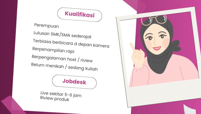 Sebuah brand sedang membuka kesempatan bagi kamu yang percaya diri, komunikatif, dan terbiasa tampil di depan kamera untuk bergabung sebagai Talent Host Live. Jika kamu suka berbicara, senang melakukan review produk, dan ingin bekerja di lingkungan kreatif, posisi ini bisa jadi cocok untukmu!