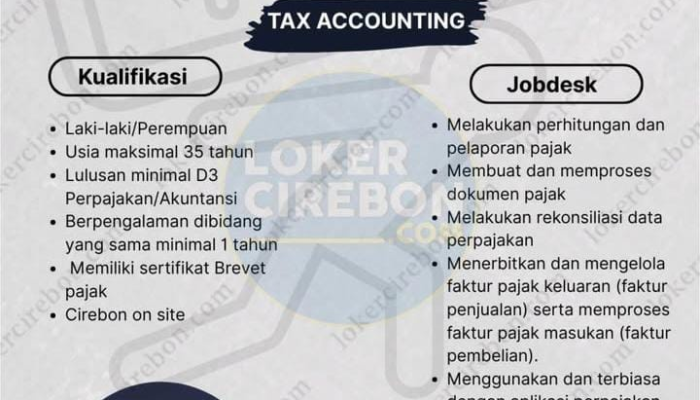 Apakah Anda seorang ahli perpajakan yang teliti dan sedang mencari tantangan baru di wilayah Cirebon? CMS saat ini membuka kesempatan bagi Anda untuk mengisi posisi strategis sebagai Tax Accounting. Kami mencari individu profesional yang memiliki pemahaman mendalam mengenai regulasi perpajakan dan akuntansi untuk memperkuat tim keuangan kami.