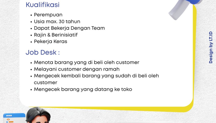 Untuk melamar posisi ADMIN di Toko Sandang Makmur, Anda harus memenuhi kualifikasi berikut: