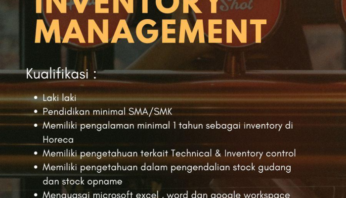 | Inventory Management (Pria) | Pendidikan minimal SMA/SMK. Pengalaman minimal 1 tahun sebagai inventory di Horeca. Menguasai Technical & Inventory Control dan Stock Opname. Menguasai Microsoft Excel, Word, dan Google Workspace. Memahami konsep FIFO/LIFO. |