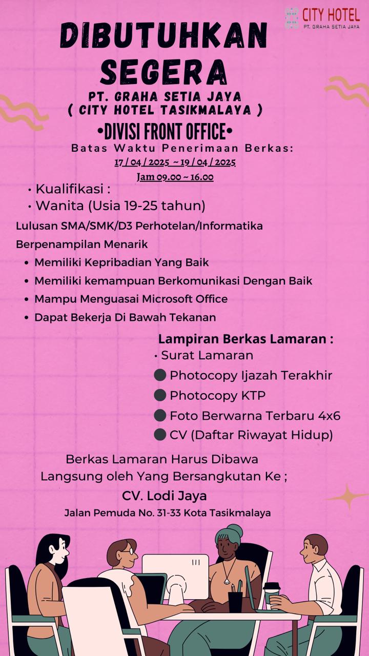 Lokertasikmalaya.ID – Update Info lowongan Kerja 16 April 2025Lowongan Kerja PT. Graha Setia Jaya (City Hotel Tasikmalaya)