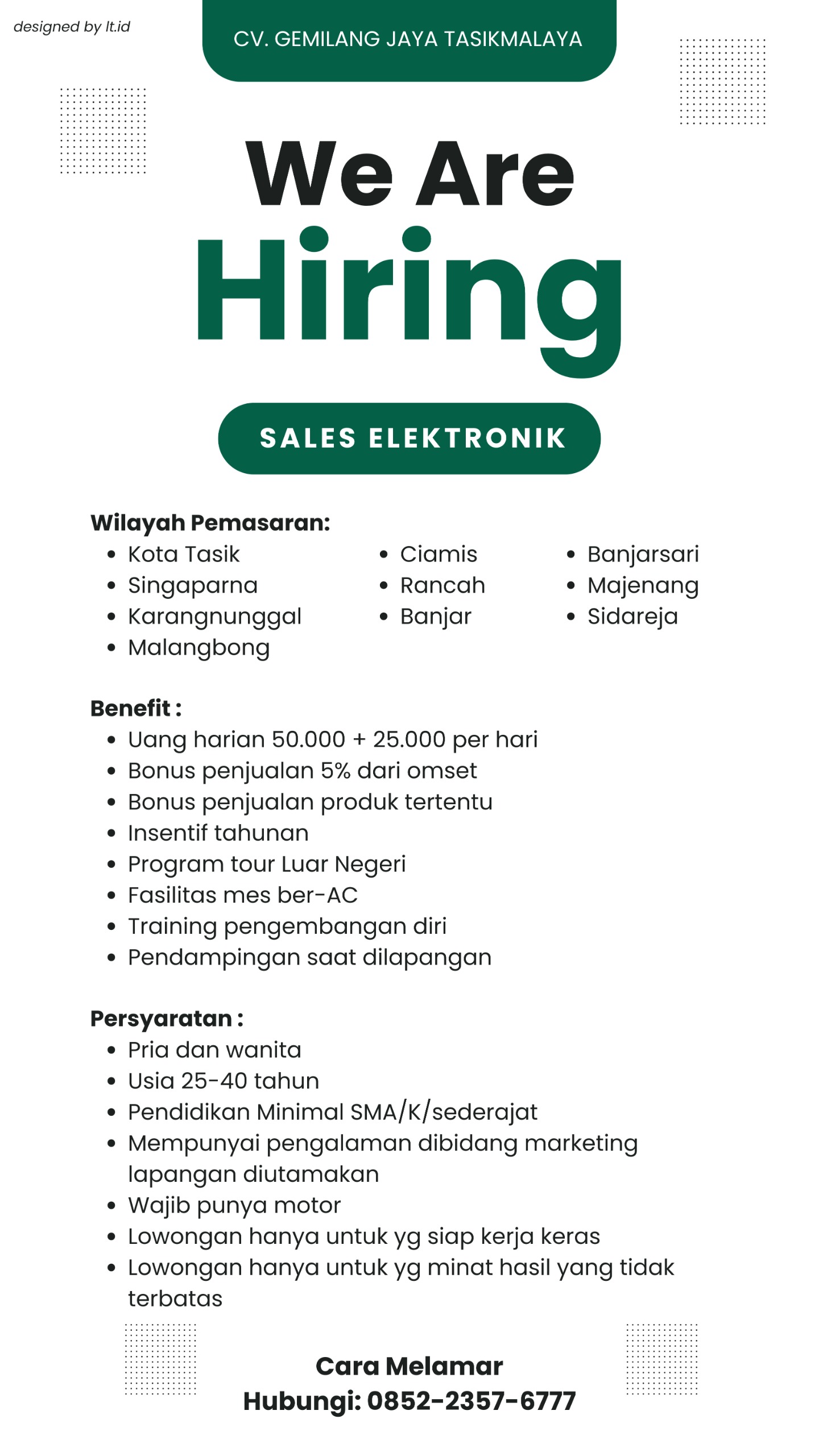 CV. Gemilang Jaya Tasikmalaya sedang mencari individu bersemangat dan berorientasi pada hasil untuk bergabung sebagai Sales Elektronik. Ini adalah kesempatan menarik bagi Anda yang ingin mengembangkan karir di bidang penjualan dengan potensi penghasilan tidak terbatas dan berbagai benefit menarik. Kami mencari kandidat yang siap bekerja keras dan menjangkau wilayah pemasaran yang luas di Jawa Barat dan sebagian Jawa Tengah.
