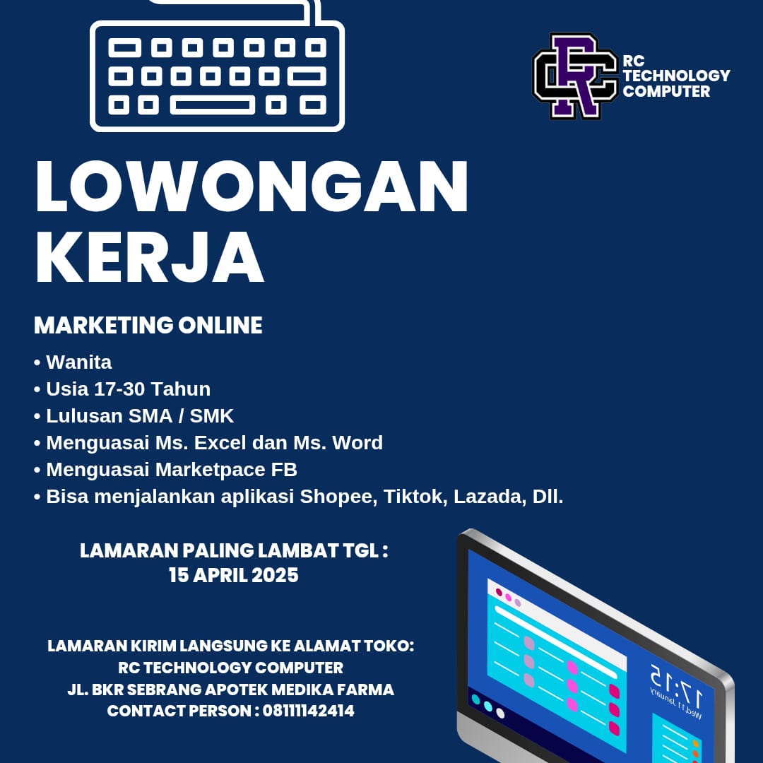 RC Technology Computer membuka lowongan untuk posisi Marketing Online dengan kriteria berikut:
