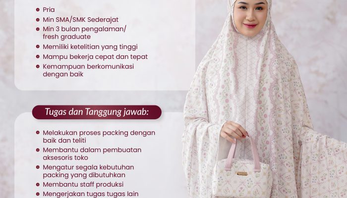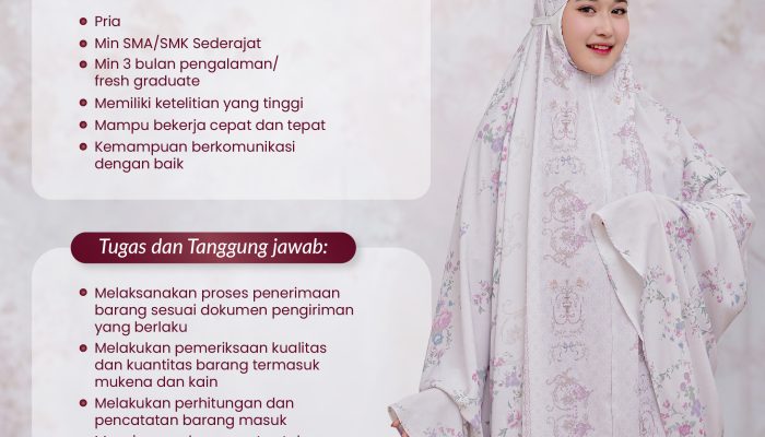 Khadijah Label sedang membuka peluang karir emas untuk dua posisi kunci: Receiving Staff dan Fullfillment Staff. Kami mencari individu yang bersemangat, memiliki etos kerja tinggi, dan siap menjadi bagian integral dalam memastikan kualitas dan kelancaran distribusi produk kami, terutama mukena dan kain premium. Baca selengkapnya untuk mengetahui detail tanggung jawab dan kualifikasi yang dibutuhkan!