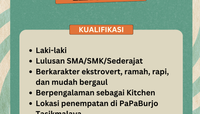Apakah Anda seorang laki-laki lulusan SMA/SMK yang memiliki minat dan pengalaman di dapur? Mencari loker Kitchen terbaru di Tasikmalaya? PaPaBurjo, salah satu tempat makan populer, sedang mencari individu yang ekstrovert, ramah, dan cekatan untuk bergabung sebagai Kitchen Staff di cabang Tasikmalaya!