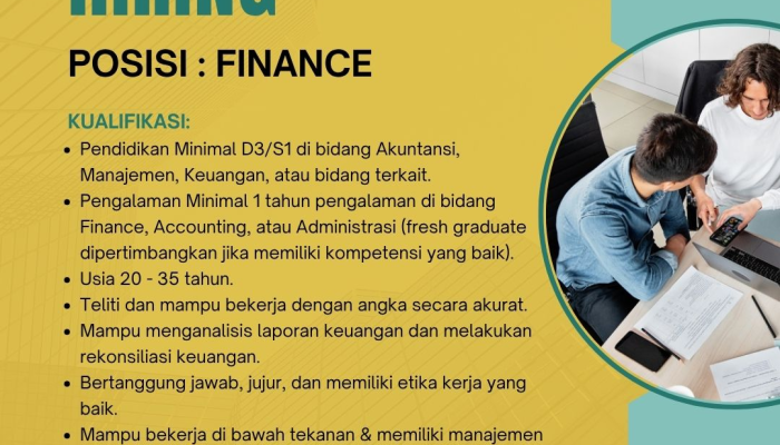Saat ini, perusahaan sedang membutuhkan tenaga profesional untuk posisi Finance yang siap bekerja dengan teliti, jujur, dan bertanggung jawab.