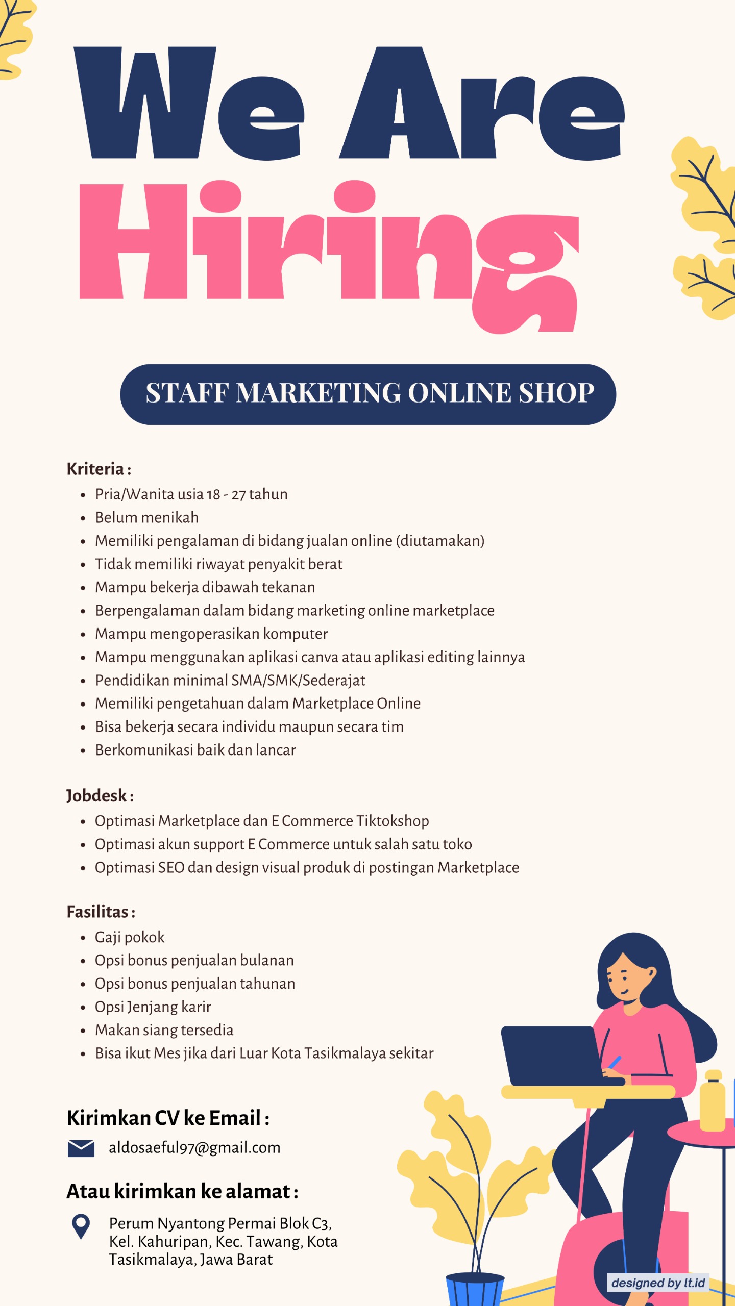 Lokertasikmalaya.ID – Update Info lowongan Kerja 17 April 2025 Lowongan Kerja Staff Marketing Online Shop
