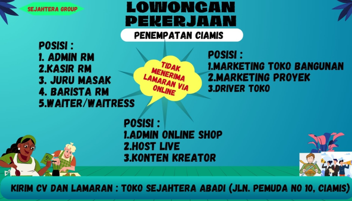 Apakah Anda sedang mencari peluang emas untuk mengembangkan karir di wilayah Ciamis? Sejahtera Group membuka kesempatan luas bagi para talenta terbaik untuk mengisi berbagai posisi strategis, mulai dari operasional retail, kuliner, hingga ranah digital. Ini adalah kesempatan Anda untuk bekerja di lingkungan yang dinamis dan mendukung perkembangan profesional. Jika Anda adalah individu yang bersemangat, bertanggung jawab, dan siap memberikan kontribusi terbaik, segera kirimkan lamaran Anda!