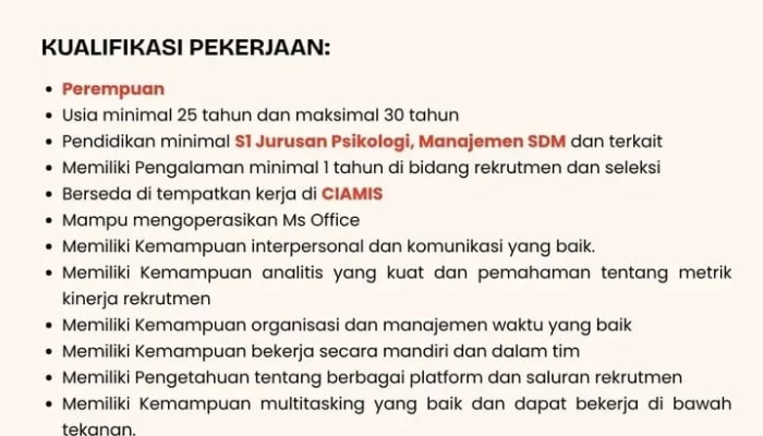 • Memiliki pengalaman minimal 1 tahun di bidang rekrutmen dan seleksi.