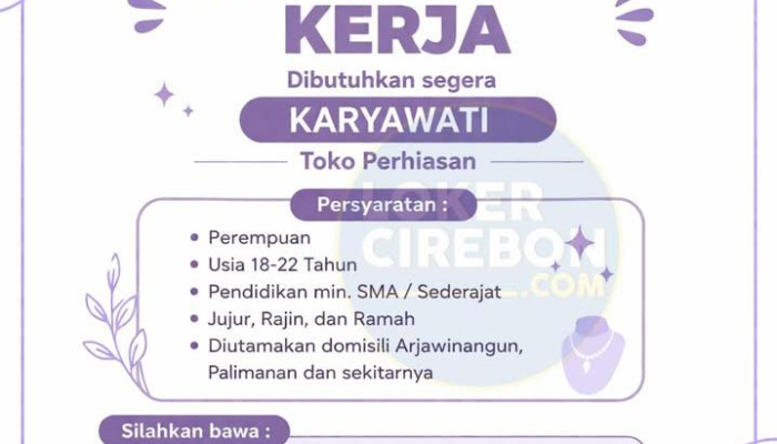 Apakah Anda seorang wanita yang memiliki antusiasme tinggi dalam dunia pelayanan pelanggan dan perhiasan? Toko Mas Damai Cantik, salah satu toko perhiasan terkemuka di wilayah Palimanan, Cirebon, sedang membuka kesempatan karir bagi Anda untuk bergabung sebagai Karyawati Toko. Jika Anda adalah pribadi yang ramah, jujur, dan ingin bekerja di lingkungan yang profesional, inilah saat yang tepat untuk melamar dan berkembang bersama tim kami.