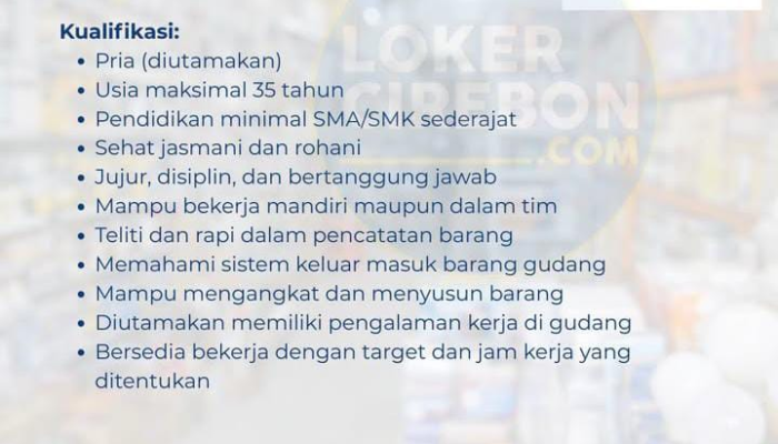 • Keahlian: Teliti dalam pencatatan barang, memahami sistem keluar masuk gudang, dan mampu mengangkat serta menyusun barang.