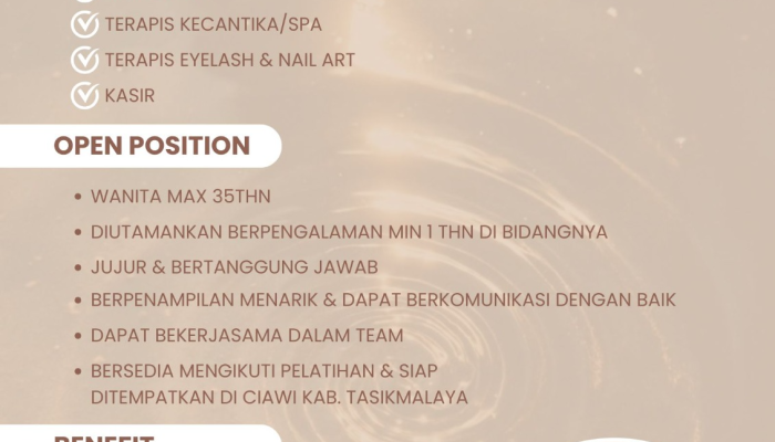 Loker Tasikmalaya – Industri kecantikan dan perawatan diri terus berkembang pesat, dan kini kesempatan emas hadir bagi Anda yang berdomisili di Tasikmalaya dan sekitarnya. Valli Beauty Spa, pusat perawatan kecantikan terkemuka, sedang mencari talenta-talenta berbakat untuk mengisi berbagai posisi strategis di cabang Ciawi.