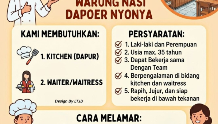 Paragraf Pembuka Apakah Anda seorang profesional di bidang kuliner yang sedang mencari peluang karir di Tasikmalaya? Warung Nasi Dapoer Nyonya, salah satu destinasi kuliner populer yang menyajikan hidangan autentik, saat ini sedang membuka kesempatan kerja besar-besaran untuk mengisi beberapa posisi strategis. Kami mengundang individu yang bersemangat, jujur, dan memiliki dedikasi tinggi untuk tumbuh bersama tim kami. Jangan lewatkan kesempatan emas ini untuk berkarir di lingkungan kerja yang hangat dan dinamis!