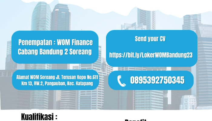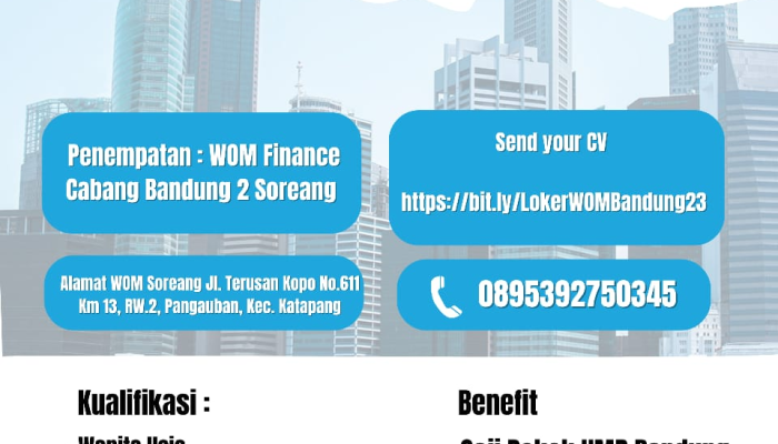 Mencari peluang karir di industri pembiayaan (multifinance) dengan gaji pokok UMK/UMR, insentif, dan jaminan sosial lengkap? WOM Finance, sebagai bagian dari Maybank Group dan anggota Swapro, membuka kesempatan kerja besar-besaran untuk berbagai posisi full-time di seluruh wilayah Jawa Barat. Kami mengundang individu bersemangat dan berorientasi target untuk posisi Marketing Agent Officer (MotorKu), Teller, Marketing, dan Collection. Segera siapkan CV Anda dan manfaatkan jadwal Walk-in Interview yang telah ditentukan!