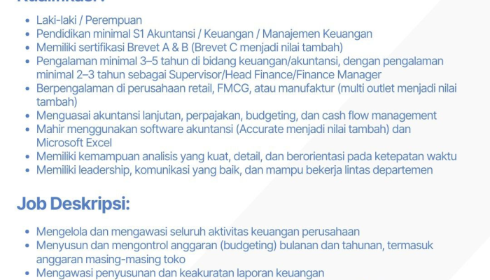 - Pengalaman minimal 3–5 tahun di bidang keuangan, dengan 2–3 tahun sebagai Supervisor/Head Finance.