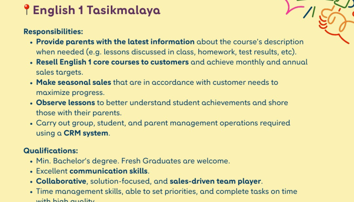 English 1 mencari individu yang berorientasi pada solusi dan penjualan untuk bergabung sebagai Progress Advisor. Posisi ini berfokus pada komunikasi dengan orang tua siswa dan pencapaian target penjualan kursus.