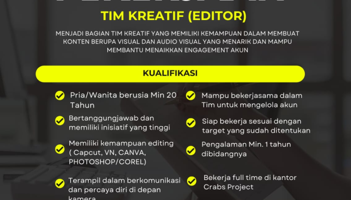 Crabs Project, perusahaan konveksi sablon dan digital printing, mencari editor berbakat untuk mengelola konten visual dan meningkatkan engagement akun.
