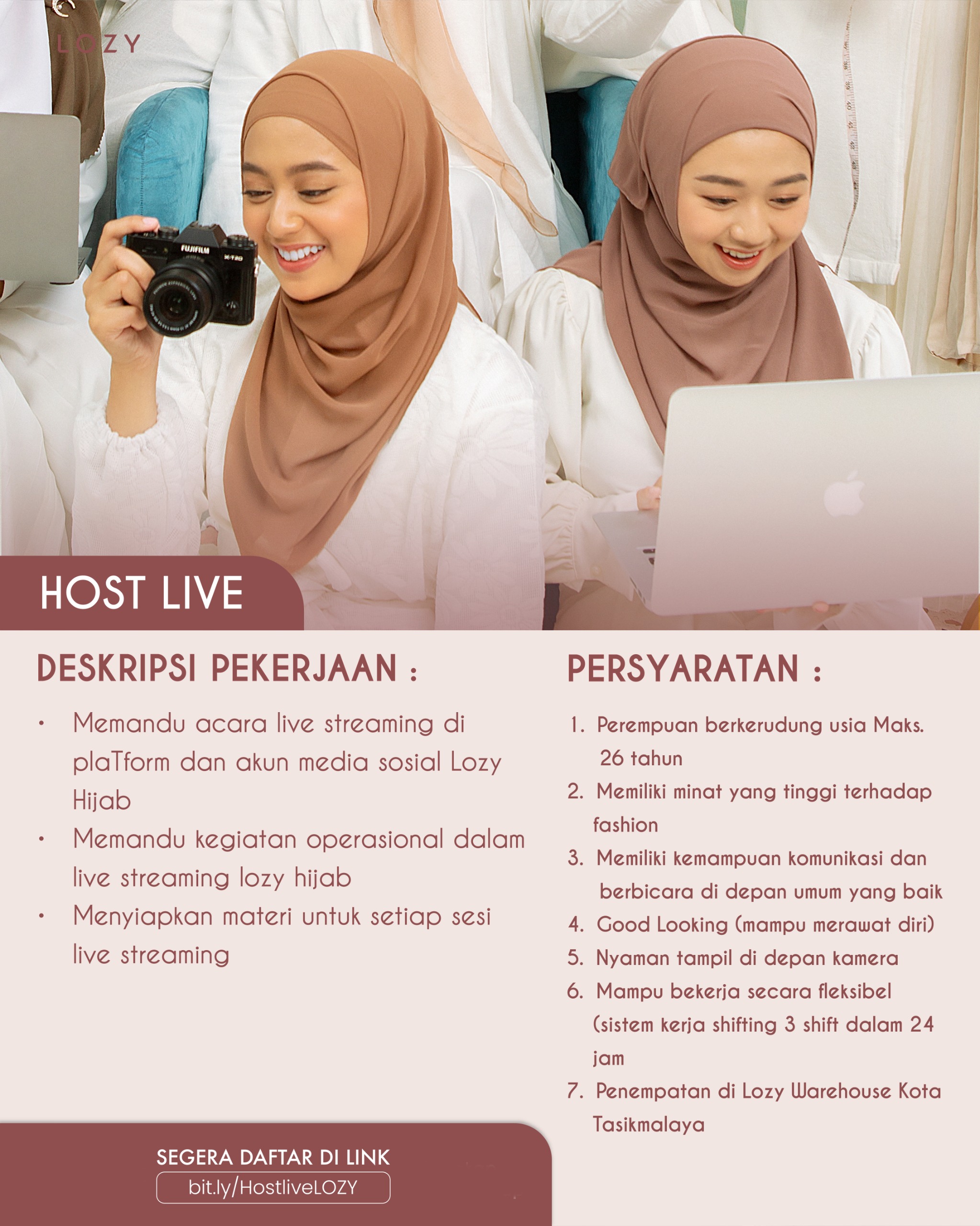 Sebagai Host Live, kandidat akan memandu acara live streaming di platform media sosial Lozy Hijab, serta menyiapkan materi untuk setiap sesi.