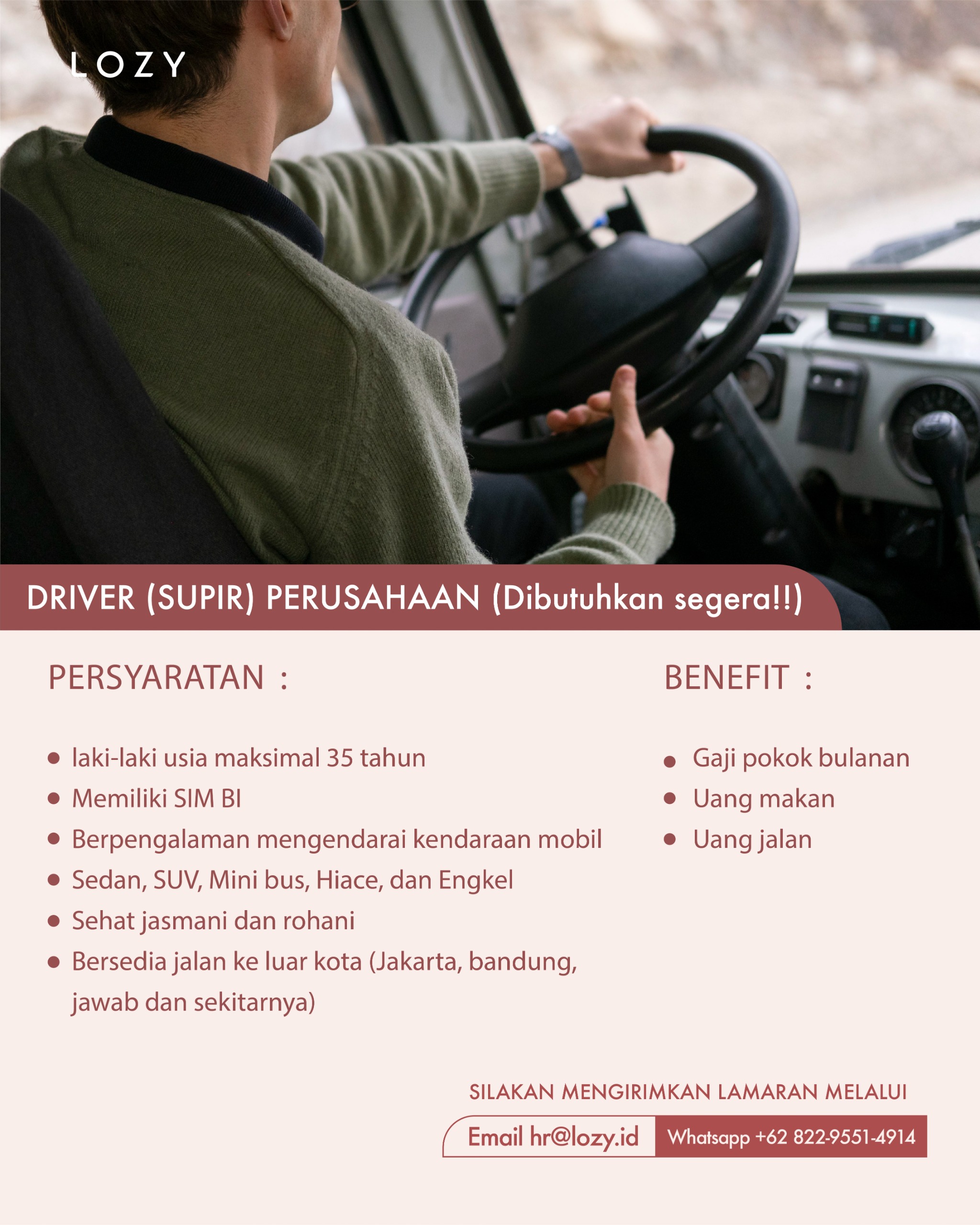 Lozy mencari supir yang berpengalaman untuk mengemudikan berbagai jenis kendaraan dalam perjalanan ke luar kota.