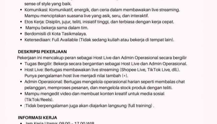 | Host Live | Bertugas membawakan live streaming (Shopee Live, TikTok Live, dll.). Punya pengalaman host live menjadi nilai tambah (+). |