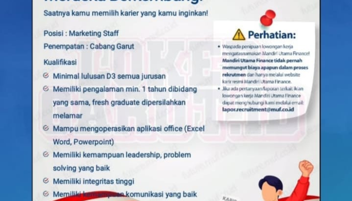 Mandiri Utama Finance, sebuah lembaga pembiayaan terkemuka yang terpercaya, membuka kesempatan bagi individu yang bersemangat dan kompeten untuk bergabung sebagai Marketing Staff. Lowongan ini merupakan peluang emas bagi Anda yang ingin mewujudkan semua mimpi dan berkarya di industri pembiayaan. Dengan penempatan di cabang Garut, Mandiri Utama Finance mencari individu yang memiliki kemampuan kepemimpinan, pemecahan masalah, dan integritas tinggi untuk berkontribusi pada pertumbuhan perusahaan. Perusahaan ini terbuka untuk berbagai latar belakang pendidikan, bahkan fresh graduate pun dipersilahkan melamar, menunjukkan komitmen mereka dalam mengembangkan talenta muda.