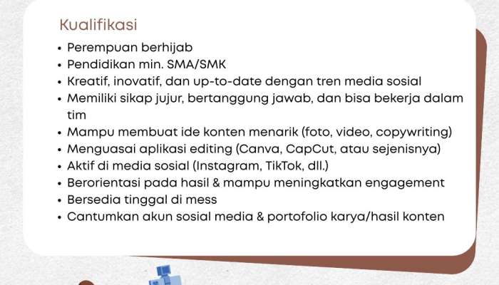 - Konten Kreator: Merancang, memproduksi (mengambil foto/video), mengedit, dan mengunggah konten menarik yang inovatif di berbagai platform media sosial untuk meningkatkan engagement dan brand awareness.